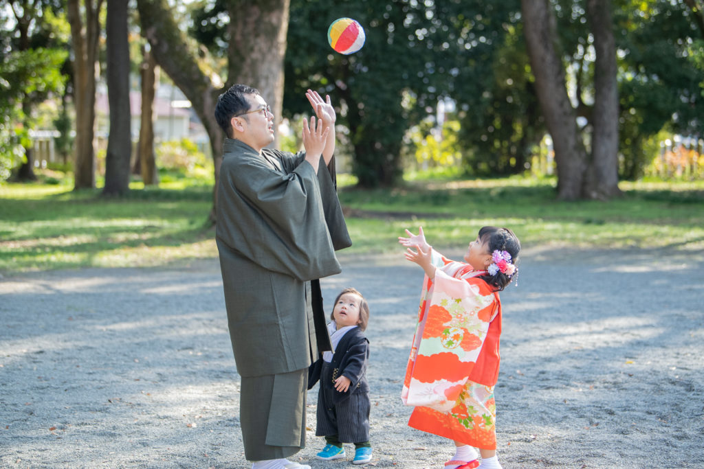 ご家族さまお着物で、ご祈祷後みんなで紙風船を楽しまれる様子も♫